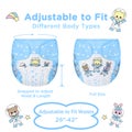 Yksi koko sopii monille vartalotyypeille, sillä vaippakuori on helposti säädettävissä neppareilla. Vyötärön säätövara on 66–107 cm ja korkeuden säätövara 74–84 cm, joten voit luoda tiiviin ja turvallisen istuvuuden, joka estää vuodot. Joustavat lahkeensuut lisäävät mukavuutta ja varmistavat, että kuori istuu täydellisesti.