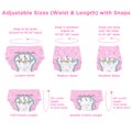 Yksi koko sopii monille vartalotyypeille, sillä vaippakuori on helposti säädettävissä neppareilla. Vyötärön säätövara on 66–107 cm ja korkeuden säätövara 74–84 cm, joten voit luoda tiiviin ja turvallisen istuvuuden, joka estää vuodot. Joustavat lahkeensuut lisäävät mukavuutta ja varmistavat, että kuori istuu täydellisesti.